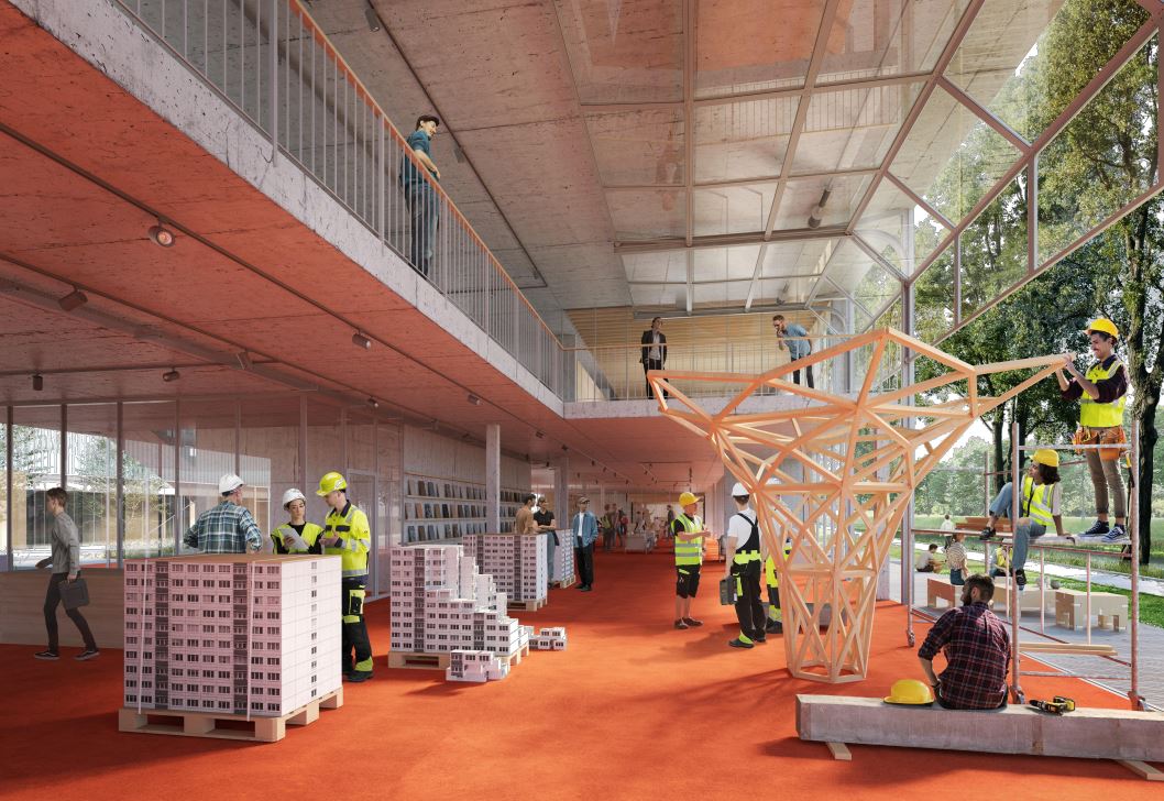 Die Gebäude bilden in ihrer Materialität und Konstruktion die baulichen Aktivitäten und Ausbildungsziele des Bildungscampus sowie die heutigen Anforderungen an klimagerechtes Bauen ab. Die Wirtschaftlichkeit in Erstellung und Betrieb steht bei der Wahl der Konstruktion und der Materialien ebenso im Fokus wie eine hohe Langlebigkeit und möglichst geringe negative Umwelteinwirkungen. Insgesamt zeigt die Anlage in ihrem Ausdruck eine entspannte, ja sogar lässige und zugleich robuste Haltung. Diese wird durch die Erkennbarkeit der eingesetzten Materialien erreicht, die einem veredelten Rohbau entsprechen. Das viele Tageslicht und die omnipräsenten Blickbezüge zum angrenzenden Naturraum unterstützen diesen Gedanken.
