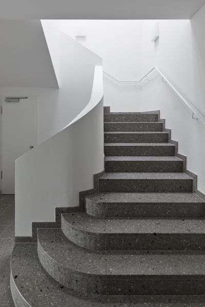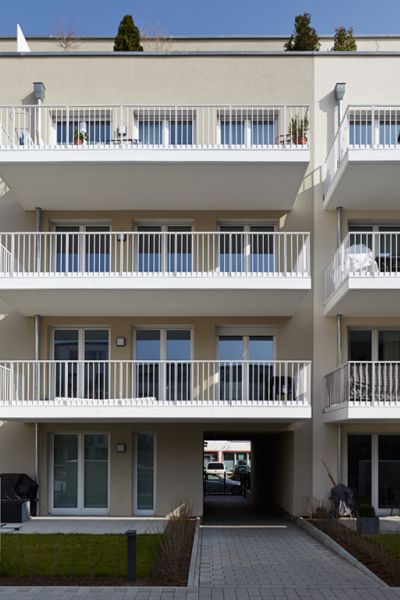 Einzig das im Innenhof freigestellte Gebäude hat eine dunkle Putzoberfläche und geschlossene Balkonbrüstungen erhalten, womit seine Solitärwirkung gestärkt wird.