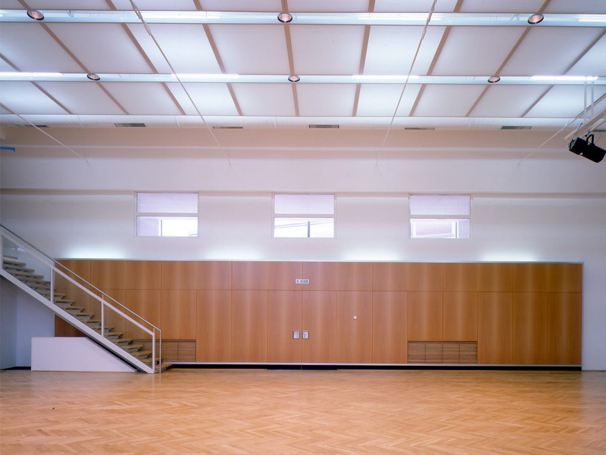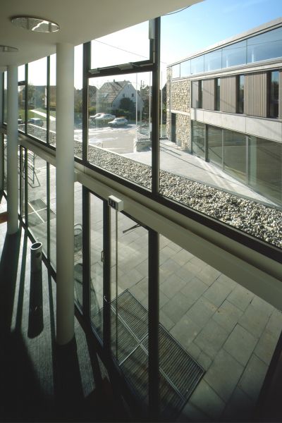 Der Bestandsbau wurde im Inneren umfangreich saniert und mit einem über seine Längsseite angebauten Foyer ergänzt. Ein längliches Pultdachgebäude entlang der westlichen Grundstückseite nimmt die neue Bibliothek und die Versammlungsräume auf. Gemeinsam mit dem Foyeranbau bildet es einen trapezförmigen, zur Straße hin geöffneten, leicht erhöhten Platzraum.