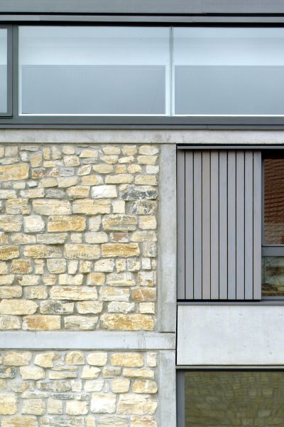 Das neue Dorfgemeinschaftshaus bedient sich modern gestalterischen Mitteln, wie Skelettbau, Sichtbeton, Metallfenster und Blechdach und schlägt mit seiner Fassade aus Bruchstein und der geneigten Dachform des Neubaus zugleich eine Brücke zum ursprünglichen Ortsbild.