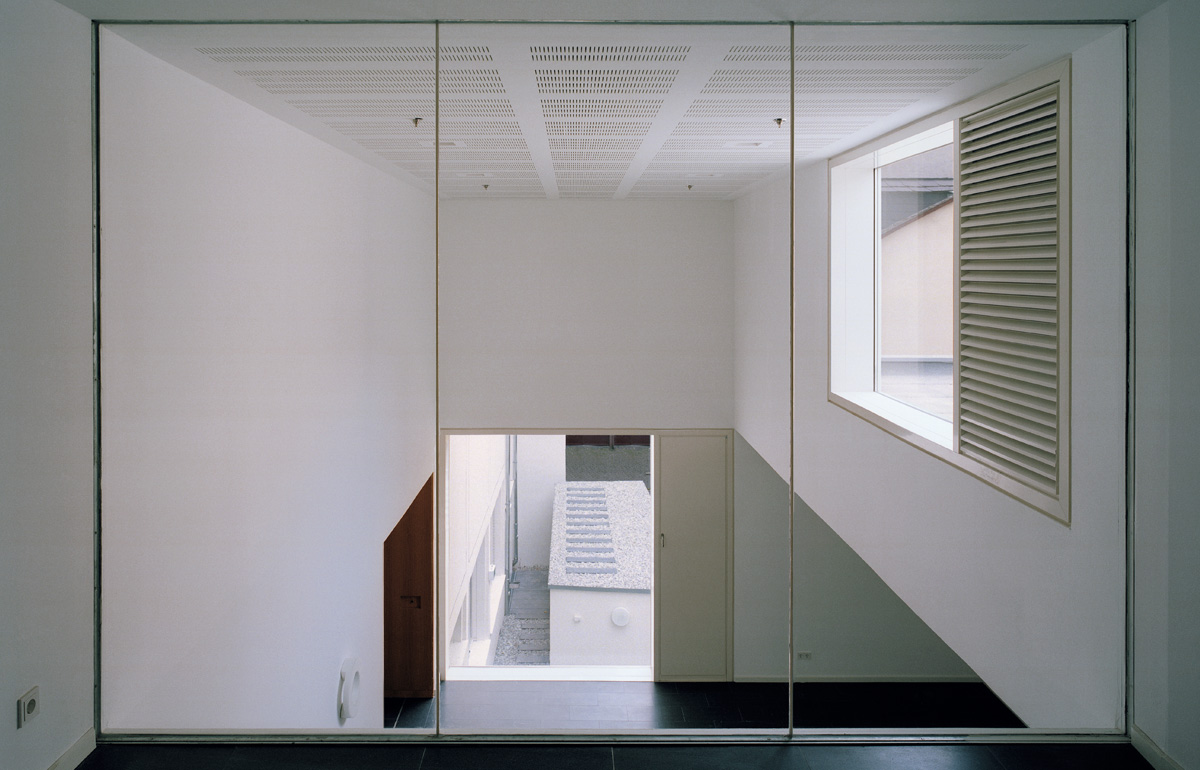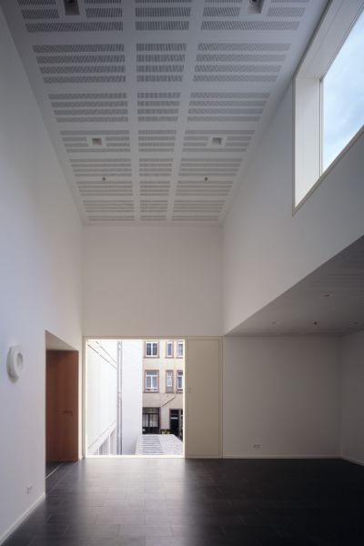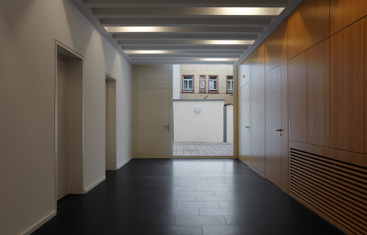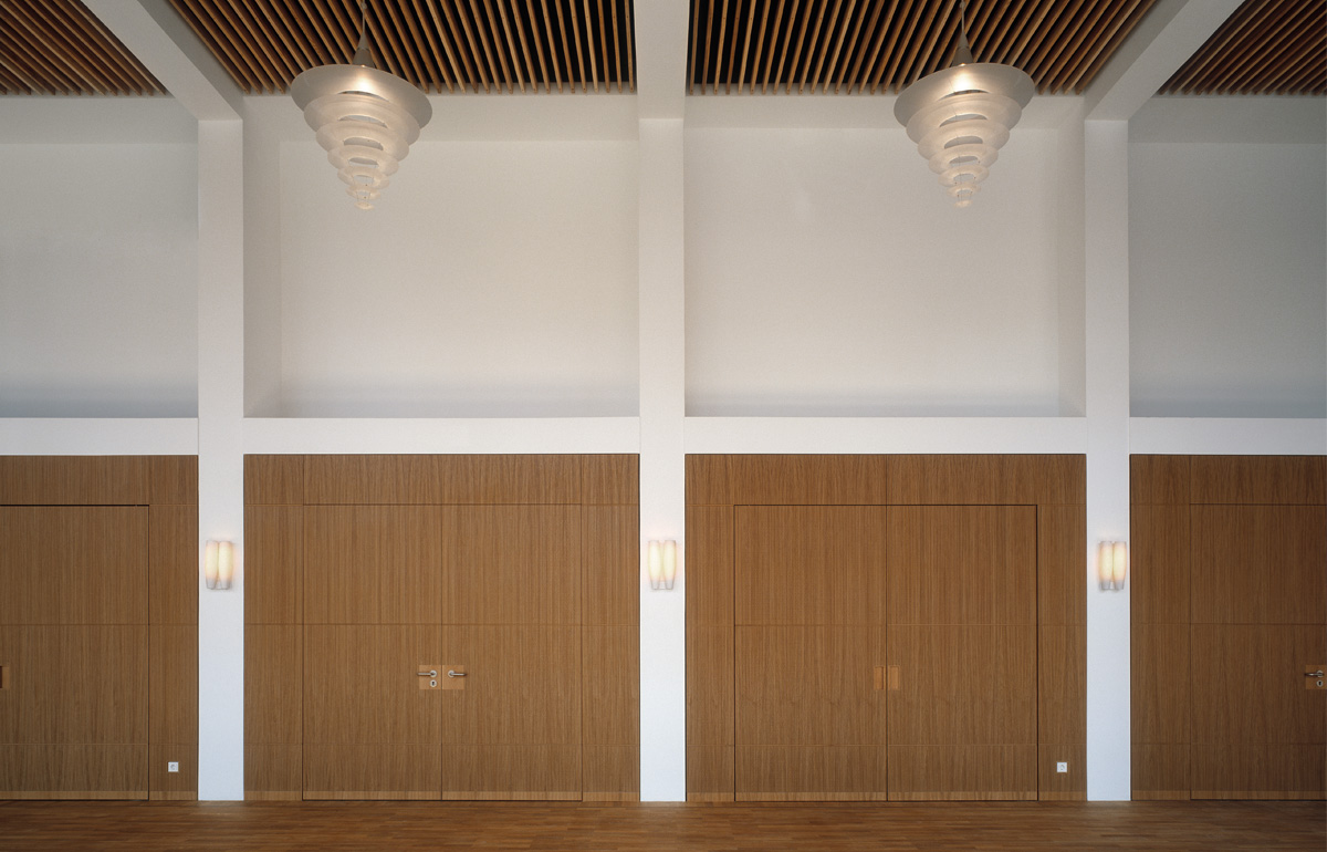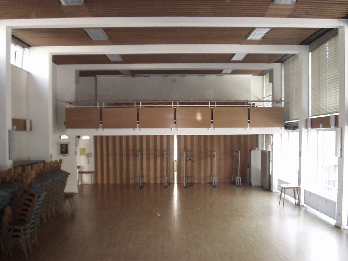 Hofseitig erfolgte eine kleine Erweiterung des Bestands. Auf einer geringen Grundfläche von nur 40 Quadratmetern zeigt der Anbau seine besondere Leistungsfähigkeit. Das Erdgeschoss bietet Raum für eine Garderobe sowie ein behindertengerechtes WC, das erste Obergeschoss verfügt nun über ein größeres, der intensiven Nutzung des Friedrich-Naumann-Saals angemessenes Foyer.