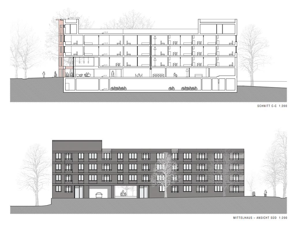 Das Konzept nimmt keine Differenzierung in der architektonisch-baulichen Qualität zwischen Freifinanzierten- und Mietwohnungen, den geförderten und Seniorenwohnungen vor. Die Bauten bilden eine ablesbare Einheit und zeigen zugleich im Maßstab angenehme Gebäudevolumen auf.