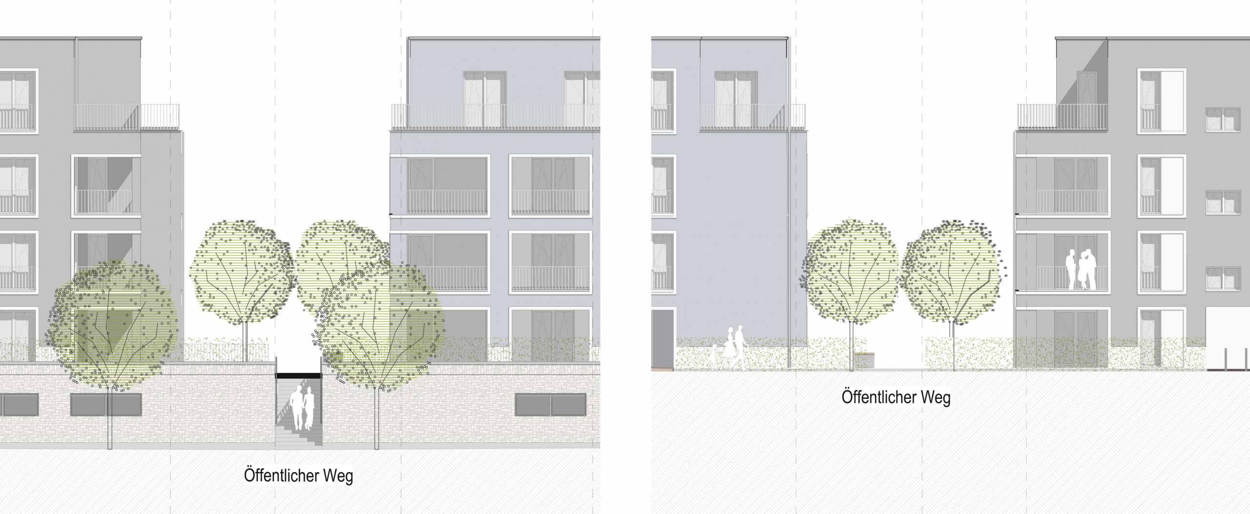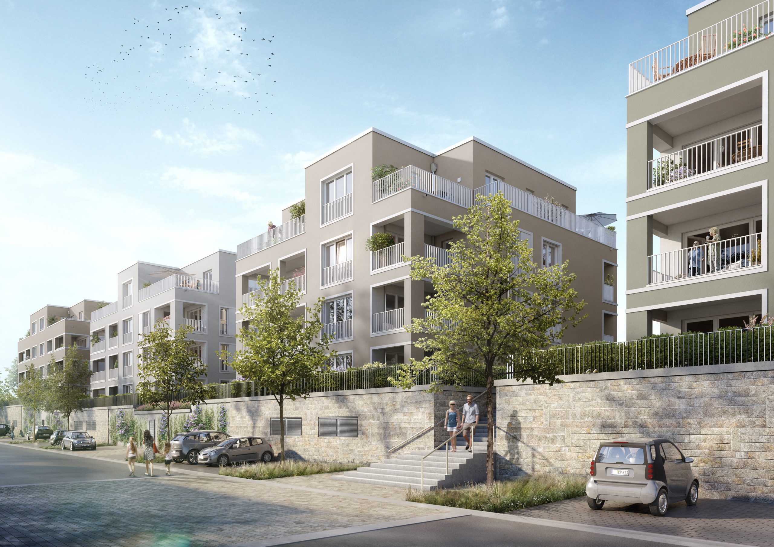 Die Zusammengehörigkeit der fünf Gebäude wird durch Struktur, Materialität und Farbgebung der Putzfassaden betont. Die Gebäudeeingänge sind als platzartige Bereiche gestaltet und dienen der Adressbildung.