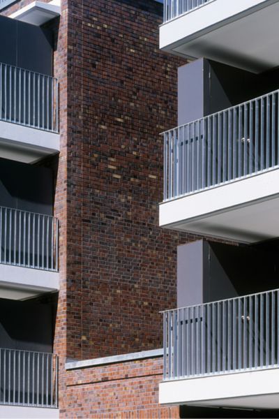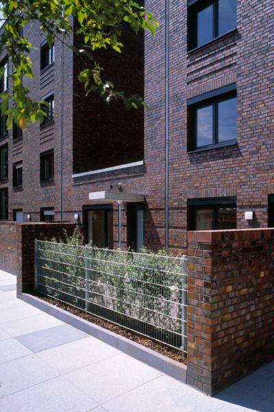 Durch die strenge Fensteranordnung und reduziert eingesetzte Fassadenelemente sind die Kanten des Gebäudekörpers klar definiert. Horizontal verlaufende Bänder verbinden nicht nur die Haupt- mit den untergeordneten Fassaden sondern auch die geschlossenen Flächen mit den Fensterflächen. Einzelne Ziegellagen sind leicht nach hinten versetzt. So wird das Mauerwerk gegliedert und erhält Plastizität.