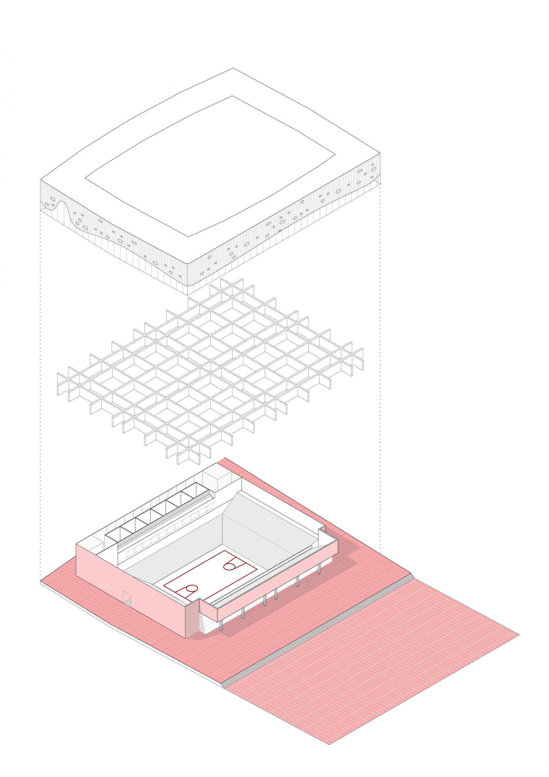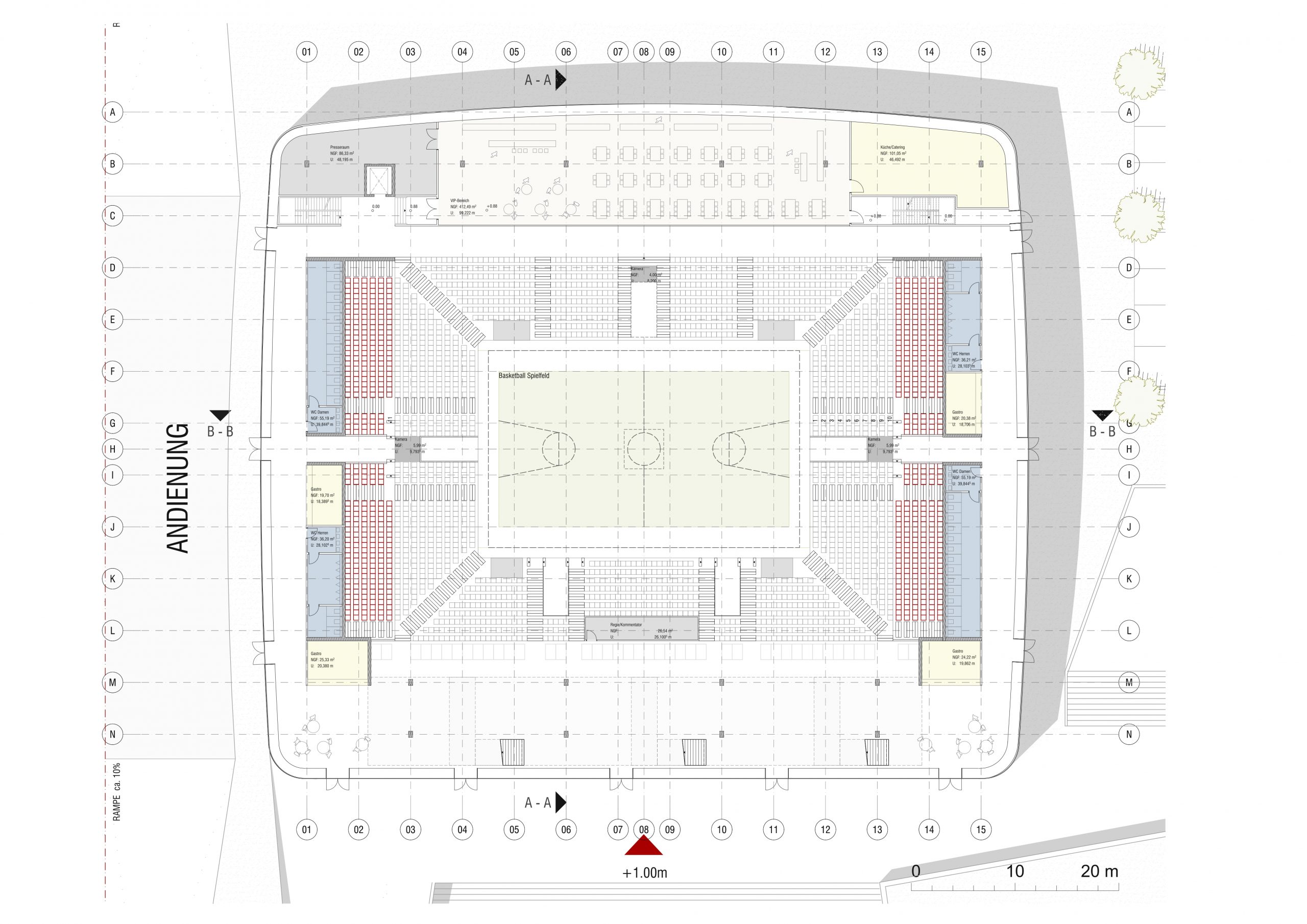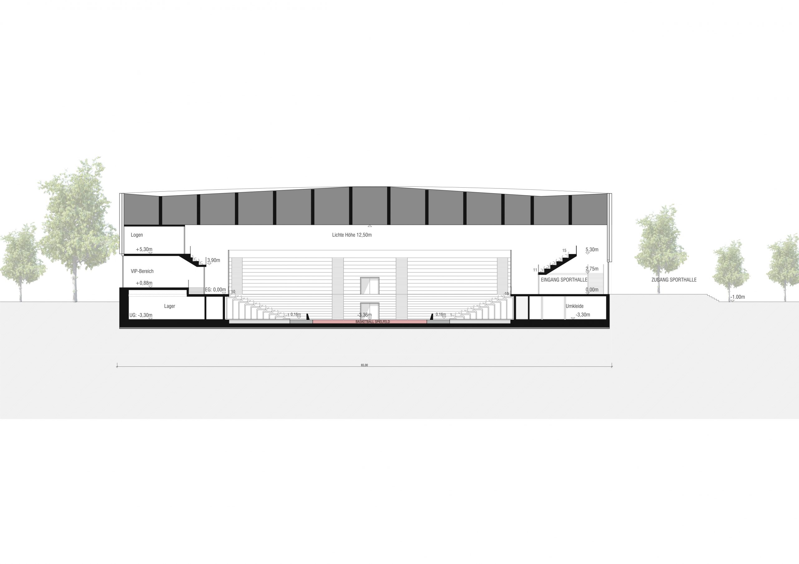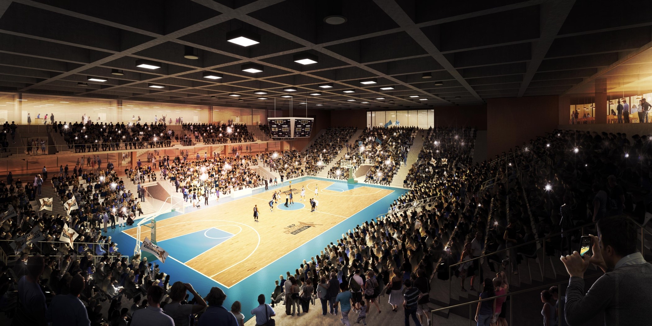 Die in den ehemaligen Patton Barracks des Heidelberger Stadtteils Kirchheim zu errichtende Sportarena besticht durch ihre Multifunktionalität. Durch verschiebbare Teleskoptribünen lassen sich unterschiedliche Spielfeldgrößen herstellen, die für den Schulsport ebenso geeignet sind wie für Heimspiele des lokalen Basketballclubs oder Handballvereins.