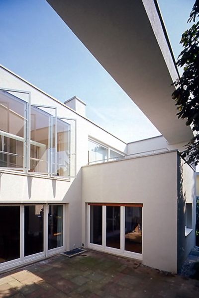 Hier und da sind die baulichen Veränderungen sichtbar. So beispielsweise in der Behandlung der Fenster, die im aufgestockten Bereich flächenbündig in die Fassade gesetzt sind und nach außen öffnen.