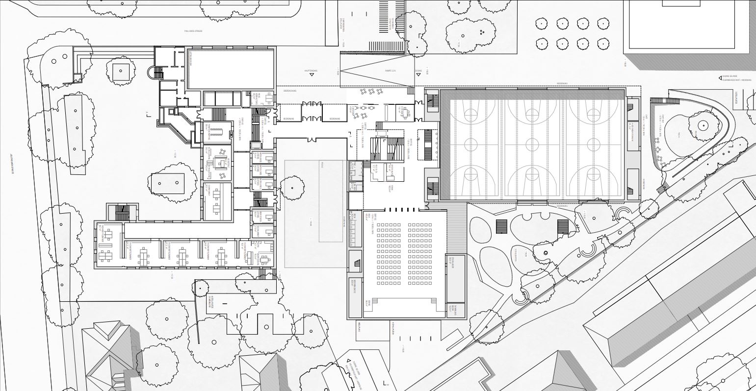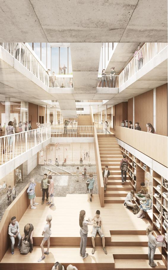 Ganz nach dem Motto „So viel Offenheit wie möglich und so viel Geschlossenheit wie nötig“ öffnet sich der Neubau im Erdgeschoss zum Quartier. Dies erfolgt einerseits durch seinen Ausdruck als transparentes, einladendes Gebäude. Andererseits sind hier öffentlichkeitswirksame Nutzungen angeordnet, die das Ausstellen, Darstellen und Vorführen ermöglichen. Hierzu zählen die Dreifeldsporthalle, die Aula, die unmittelbar am Eingang positionierte Cafeteria und die zentrale Schultreppe.