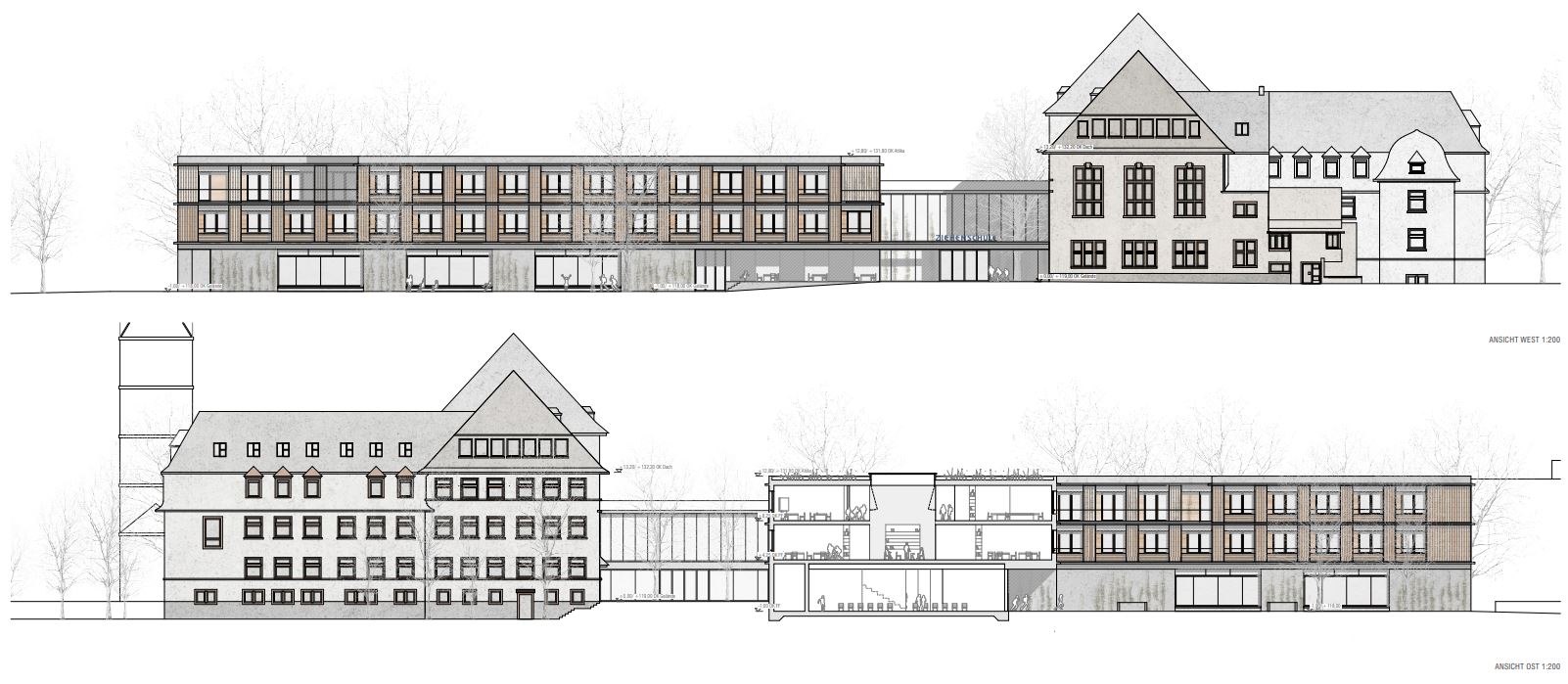 In der dargestellten Zuweisung sind im Altbau die Verwaltung, Fachbereiche Kunst, Sprachen, Gesellschaftswissenschaften sowie die Cluster der Jahrgänge acht bis zehn angeordnet. Die erforderlichen Umbauten im Bestand erfolgen durch einfache konstruktive Maßnahmen. Der schönste Raum des Altbaus, an der Fassade mit zwei Geschosse hohen Fensterelementen erkennbar, nimmt die Bibliothek auf.