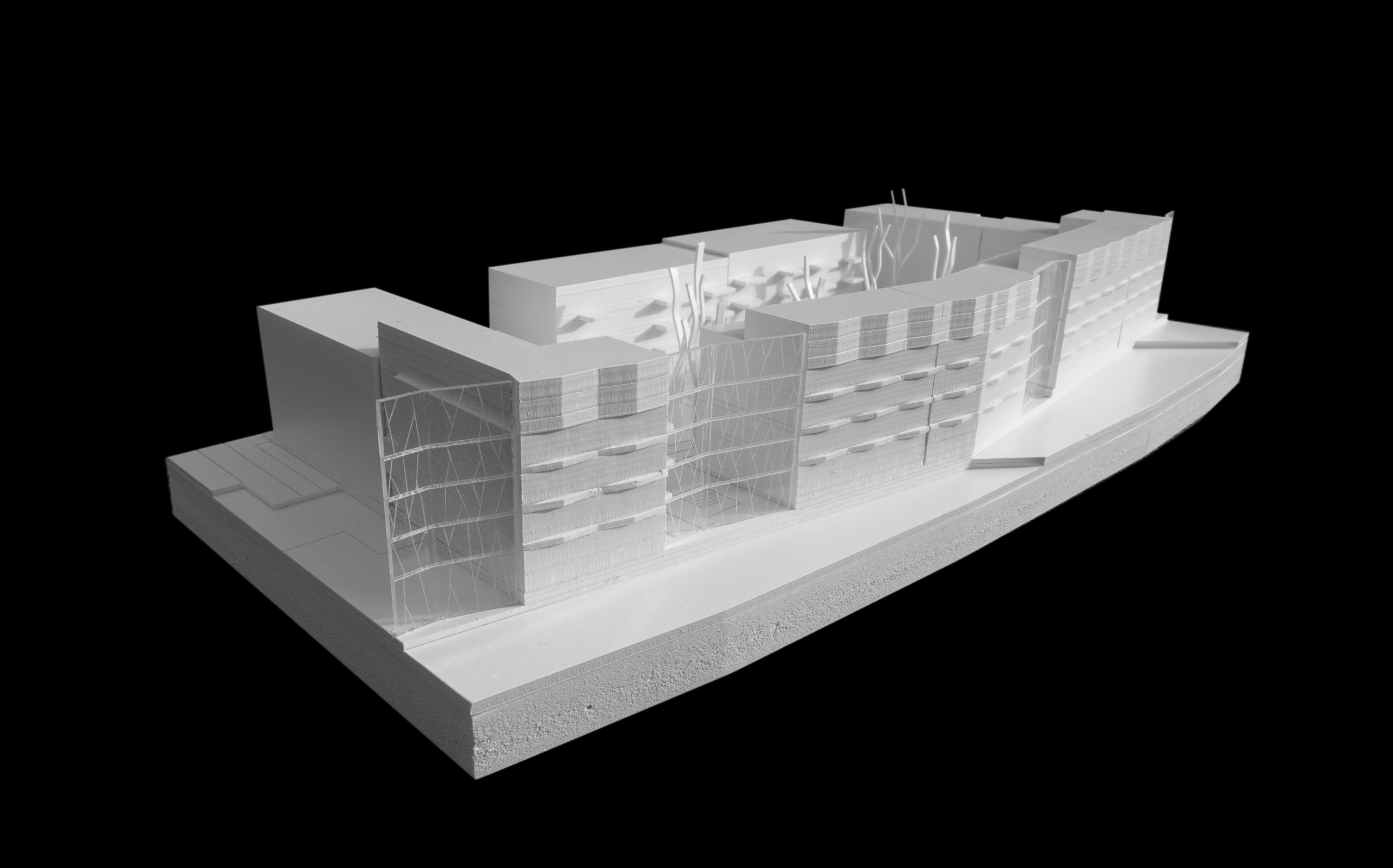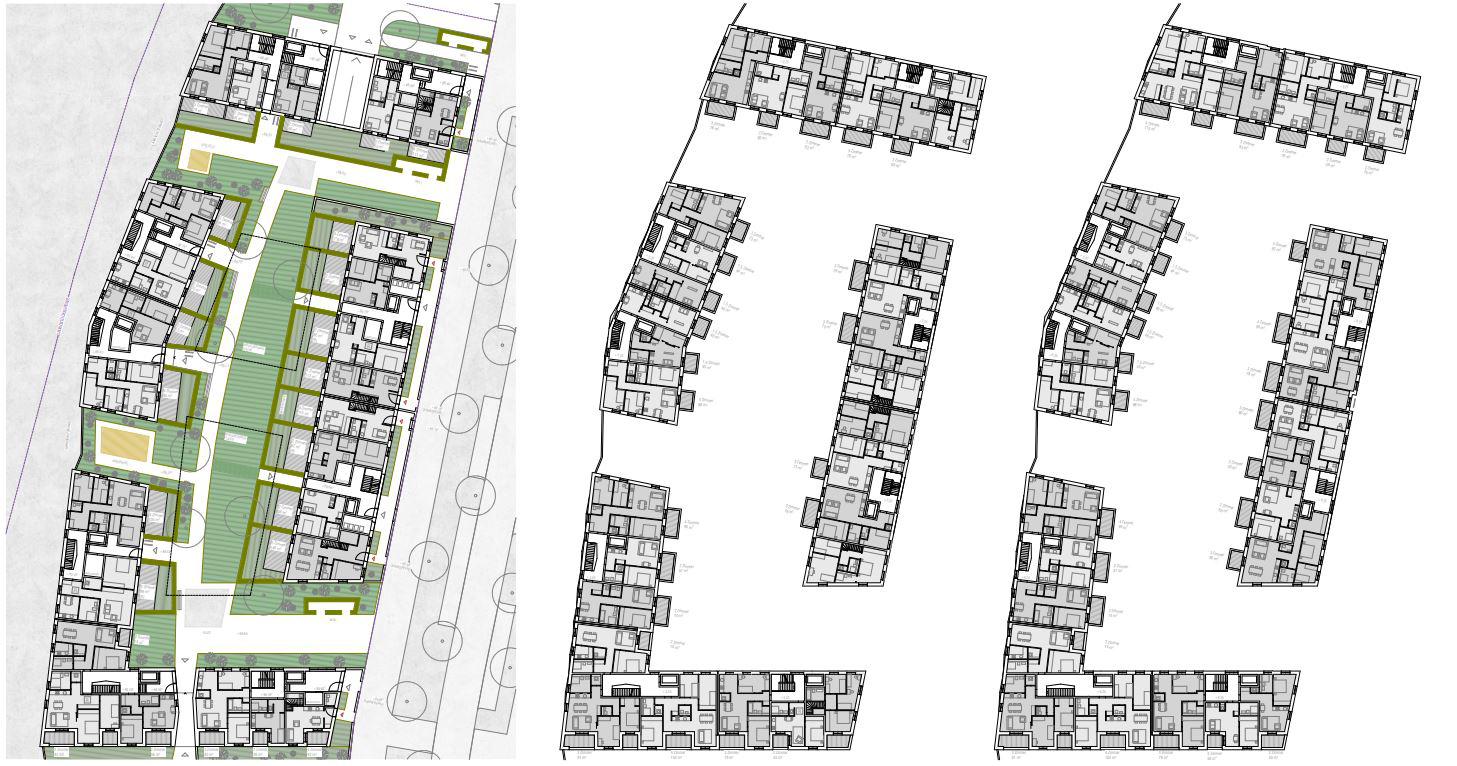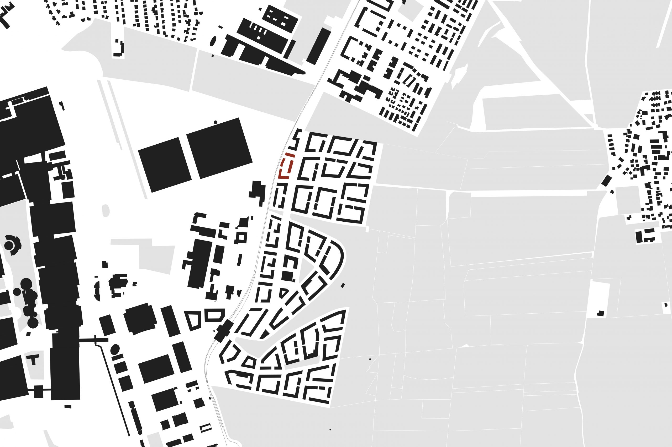 The courtyards are accessed in three places, and access roads for the fire brigade are also provided here. The sealing areas are minimized and the required path areas are largely routed above the underground car park. The drainage of the paved areas takes place directly into the undeveloped areas between the underground car park as infiltration. The western residential buildings are reached from the central access route. Bicycle parking spaces are provided at the entrances to each residential unit. Seating options are arranged at the entrances along the access path.